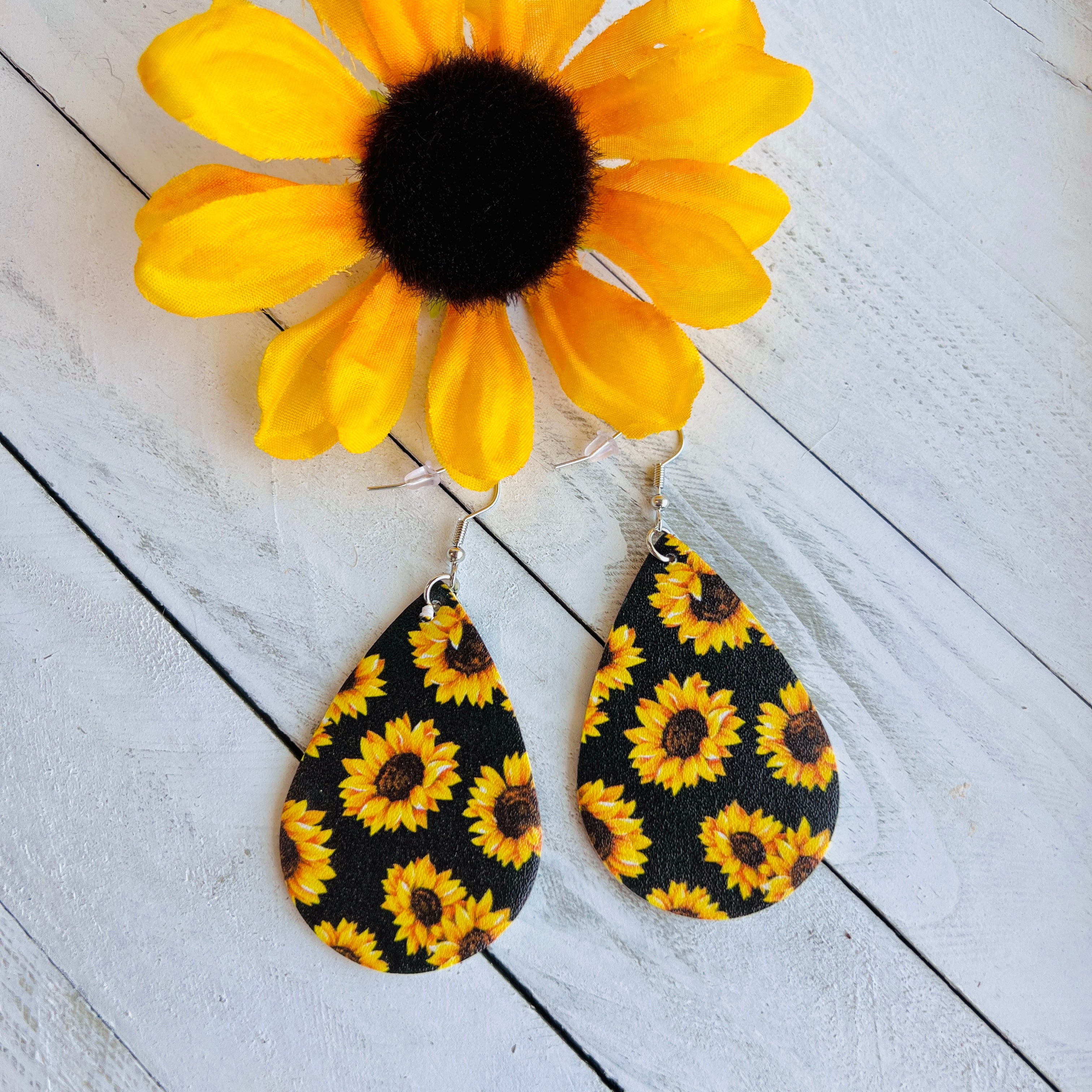 Sunflower Black Background Faux Leather Teardrop Ear Bling Two Styles Available
