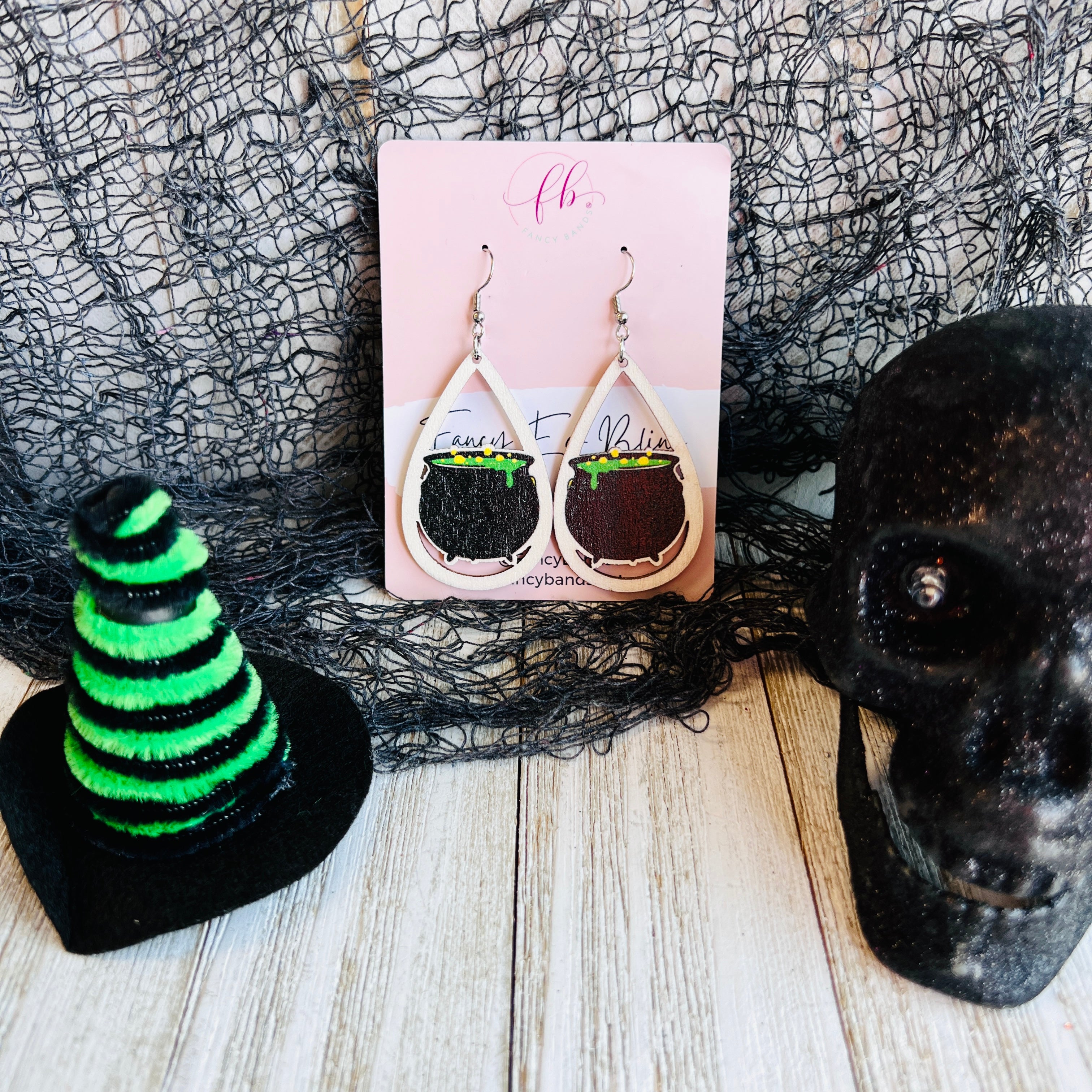 Witches Brew Cauldron Wooden Drop Ear Bling
