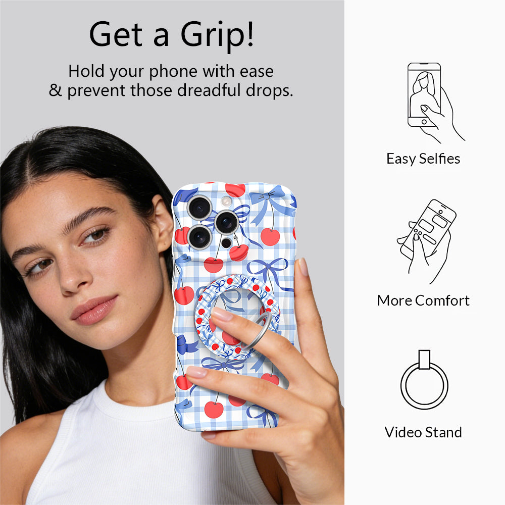 Sweeten up your style with the "Cherry On Top" Hold It Fancy MagSafe Grip Ring. Featuring a charming coquette-inspired pattern of bright red cherries and dainty blue ribbons tied in bows, set against a classic blue and white gingham background, this accessory adds a playful, picnic-ready vibe to any MagSafe-enabled device. While it serves as a cute statement piece on a plain white case, it is designed to pair perfectly with our matching Fancy phone case for a flawless, coordinated look.