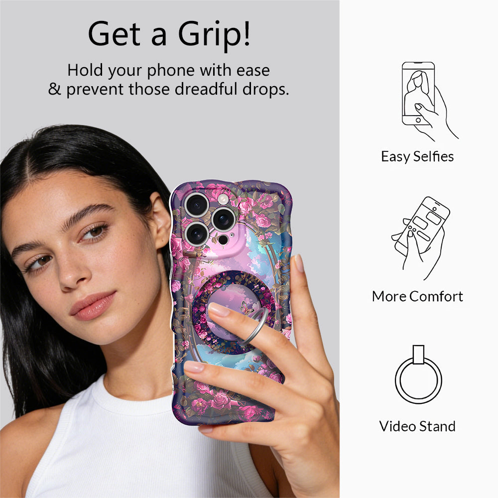 Whether you are dressing up for an evening out, love the "dark academic" aesthetic, or simply appreciate a classic floral with an edge, the Enchanted Skies MagSafe ring grip gives you the security and confidence you need. The sophisticated contrast of dark blue and bright pink turns your phone into a romantic statement piece.
