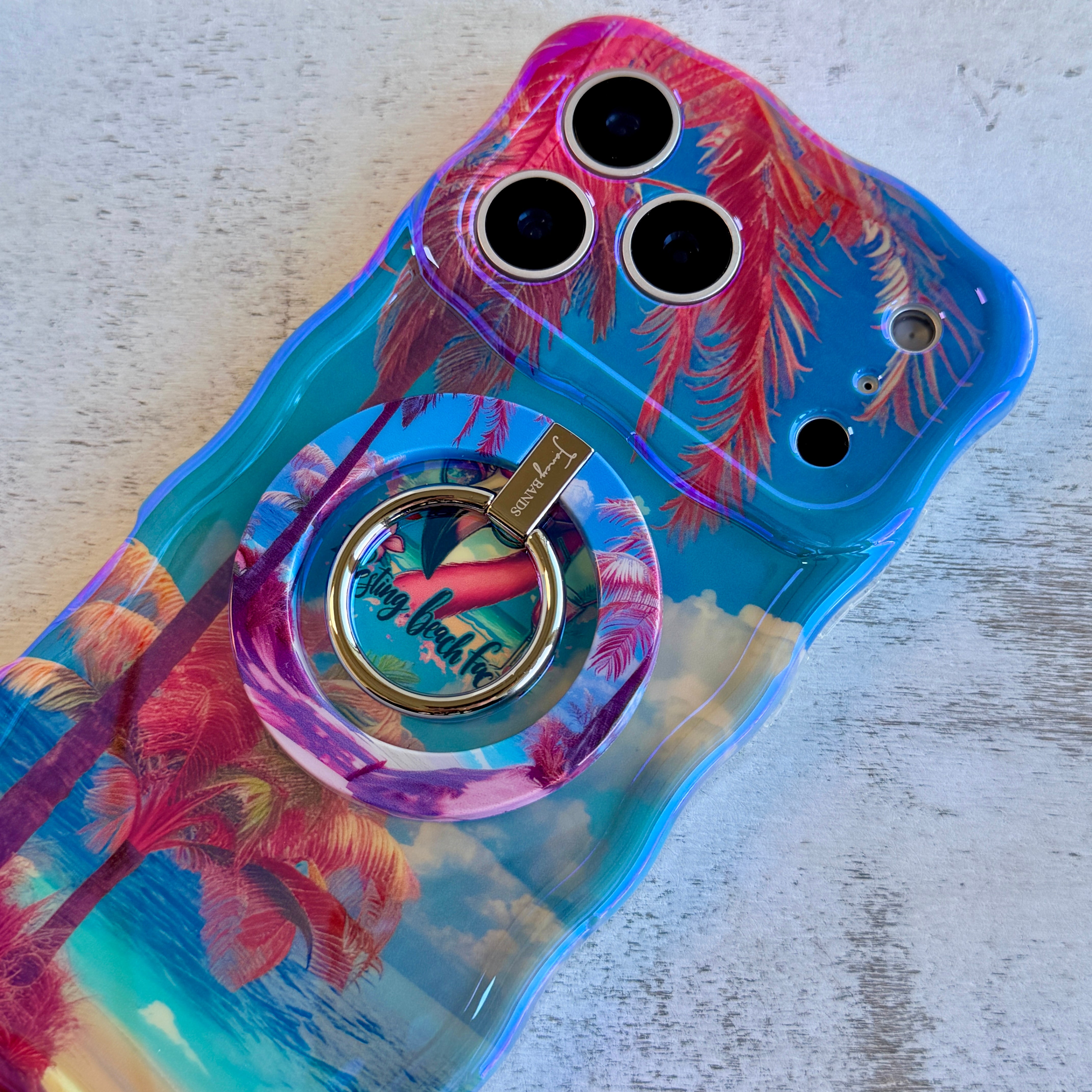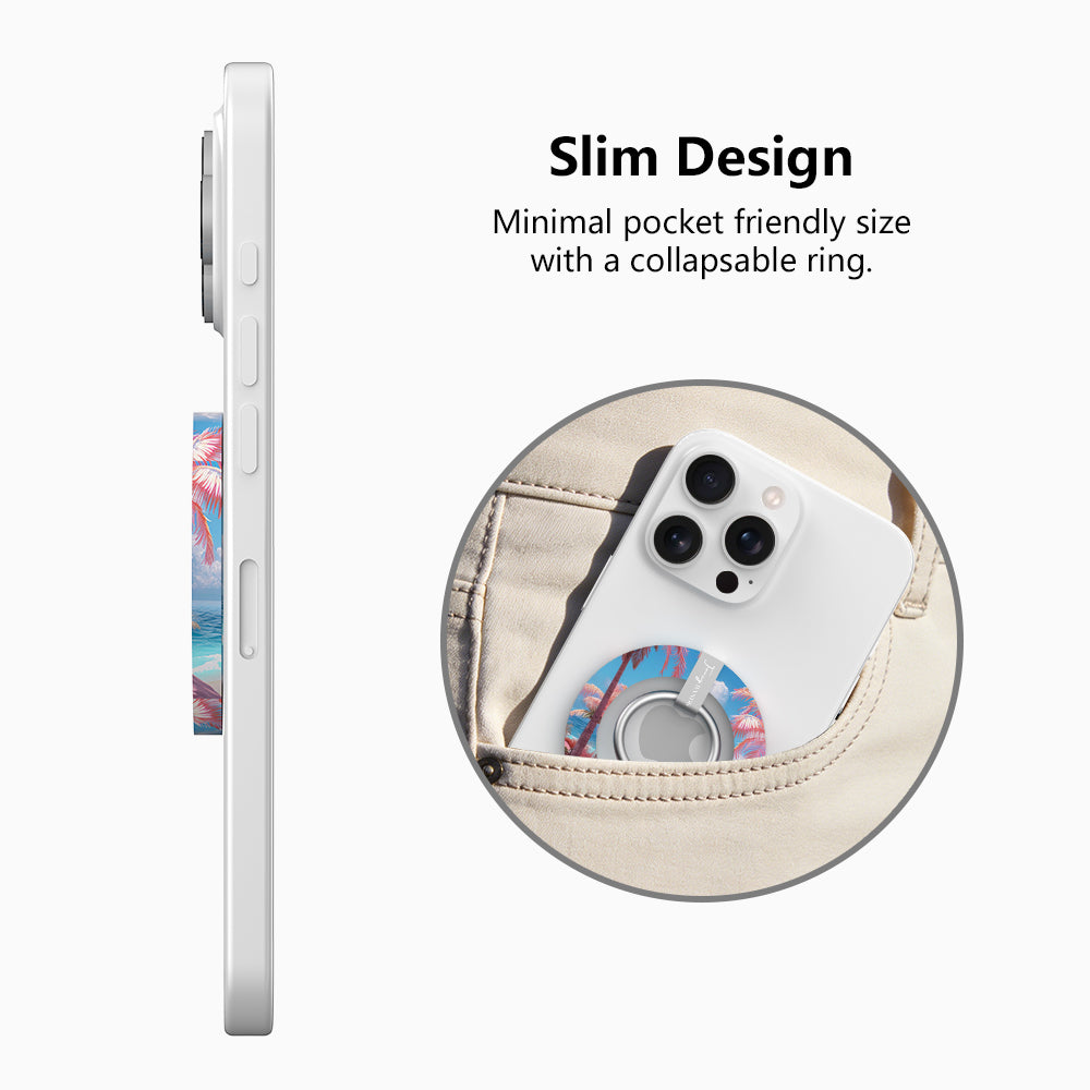 Transport yourself to paradise with the "Resting Beach Face" Hold It Fancy MagSafe Grip Ring. Featuring a dreamy tropical landscape with surreal pink sands, swaying palm trees, and crystal-clear turquoise waters, this accessory brings vacation vibes to any MagSafe-enabled device. While it serves as a mini-getaway on a plain case, it is designed to pair perfectly with our matching Fancy phone case for a flawless, coordinated look.