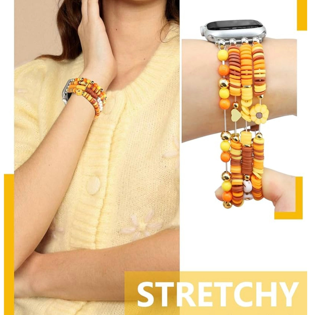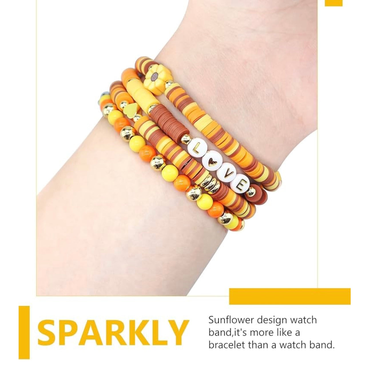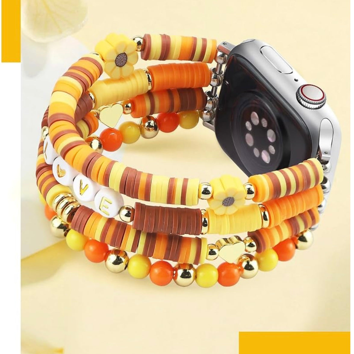 Fall in ❤️ with your wrist this season! The Autumn Love Story Heishi Bracelet Band brings cozy fall vibes with warm orange, golden yellow, and earthy tones—finished with ✨ gold accents, a 🌻 sunflower charm, and playful LOVE beads. Stretchy, comfy, and oh-so stylish—it's the perfect mix of fashion jewelry and a functional watch band.