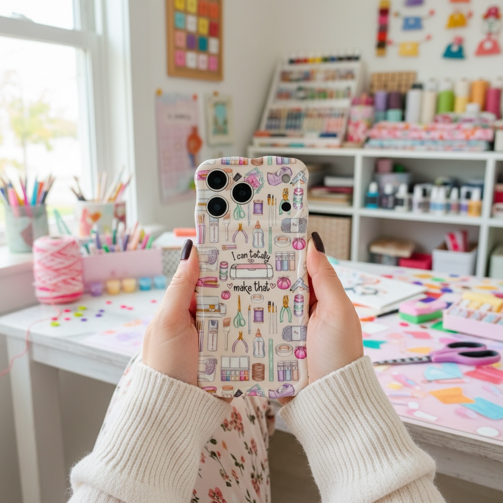 Whether you're a scrapbooker, quilter, painter, knitter, or all-around maker, this artistic iPhone case from Fancy Bands celebrates your creative passion. The hand-drawn watercolor design features your favorite craft supplies—scissors, paintbrushes, thread spools, paint palettes, glue bottles, and more. It's the perfect craft phone case for anyone who sees potential in every project and lives by the motto "I can totally make that." 🎨✂️