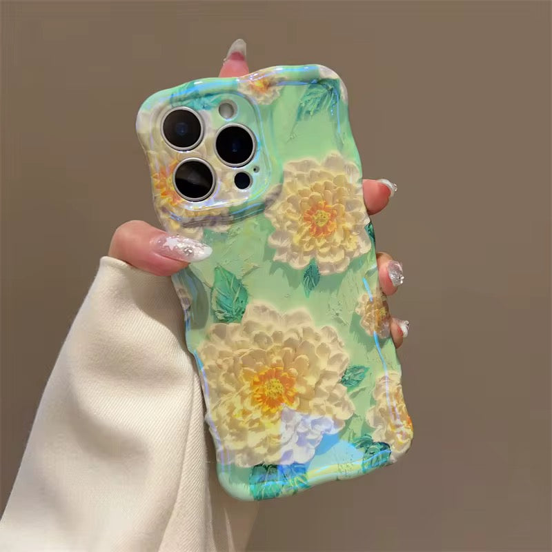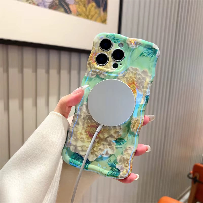 Elevate your iPhone's style with the Wavy Luxe MagSafe Case. This case combines an artistic wavy edge design with vivid floral prints, offering a sleek and elegant look. The high-gloss, iridescent outer layer reflects light beautifully, creating a mesmerizing color-shifting effect—shimmering with hues like an oil-slick or water ripple, depending on the angle and lighting. It's designed for both aesthetics and functionality, providing reliable protection and seamless MagSafe compatibility for effortless charging and accessory attachment.