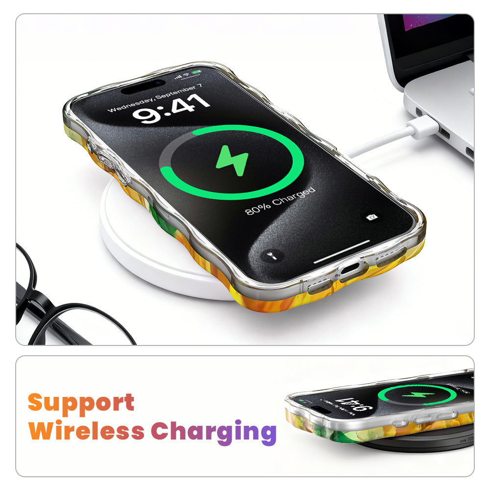 Elevate your iPhone's style with the Wavy Luxe MagSafe Case. This case combines an artistic wavy edge design with vivid floral prints, offering a sleek and elegant look. The high-gloss, iridescent outer layer reflects light beautifully, creating a mesmerizing color-shifting effect—shimmering with hues like an oil-slick or water ripple, depending on the angle and lighting. It's designed for both aesthetics and functionality, providing reliable protection and seamless MagSafe compatibility for effortless charging and accessory attachment.