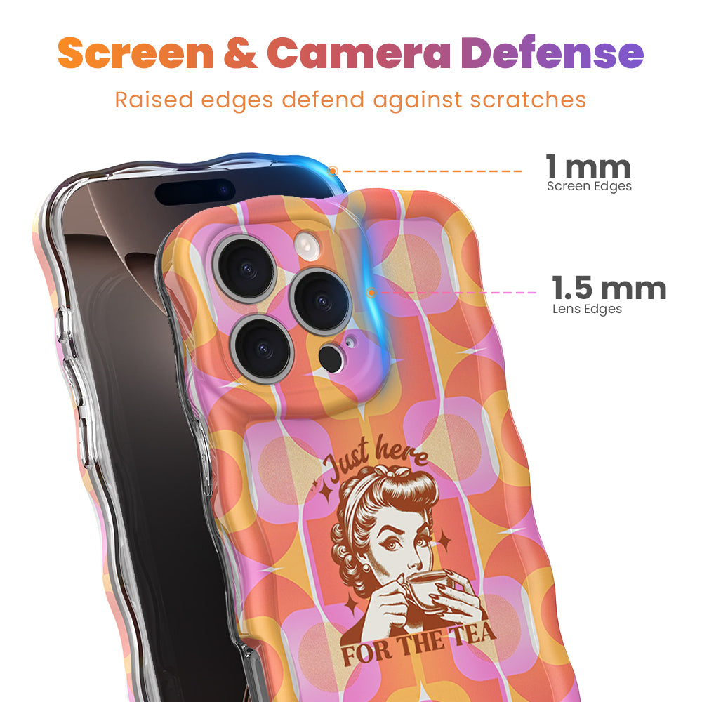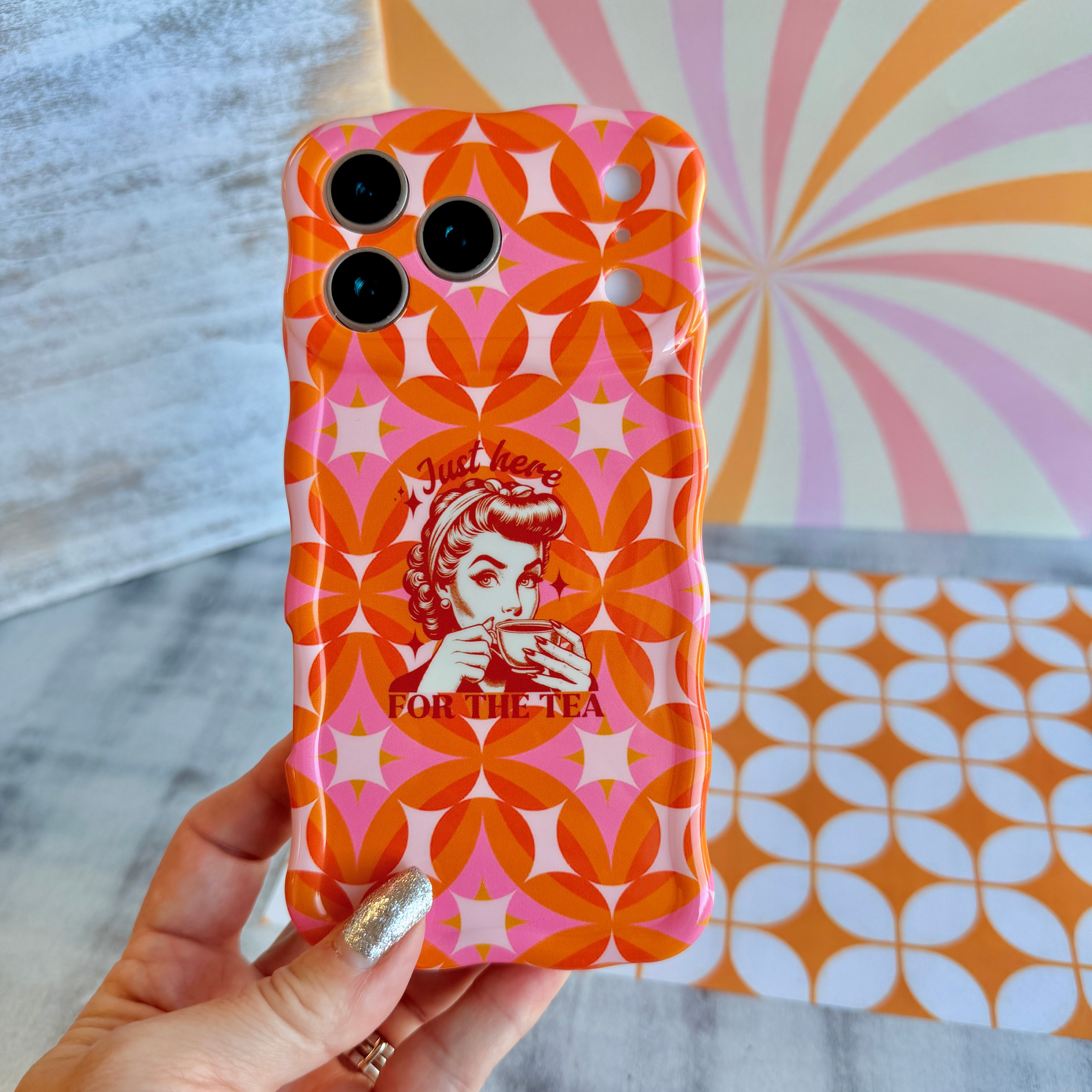 Wavy iPhone case featuring an orange and pink geometric star pattern with a vintage woman graphic and text Just here FOR THE TEA.