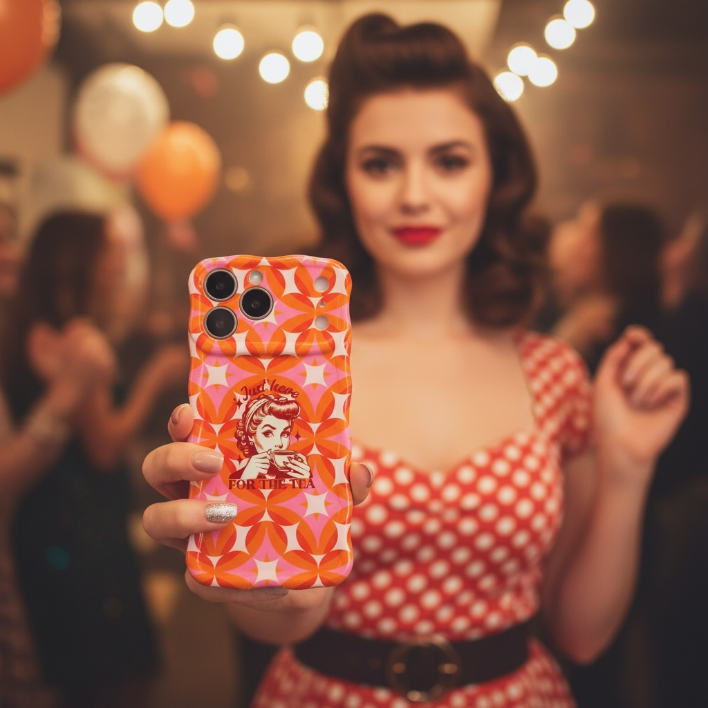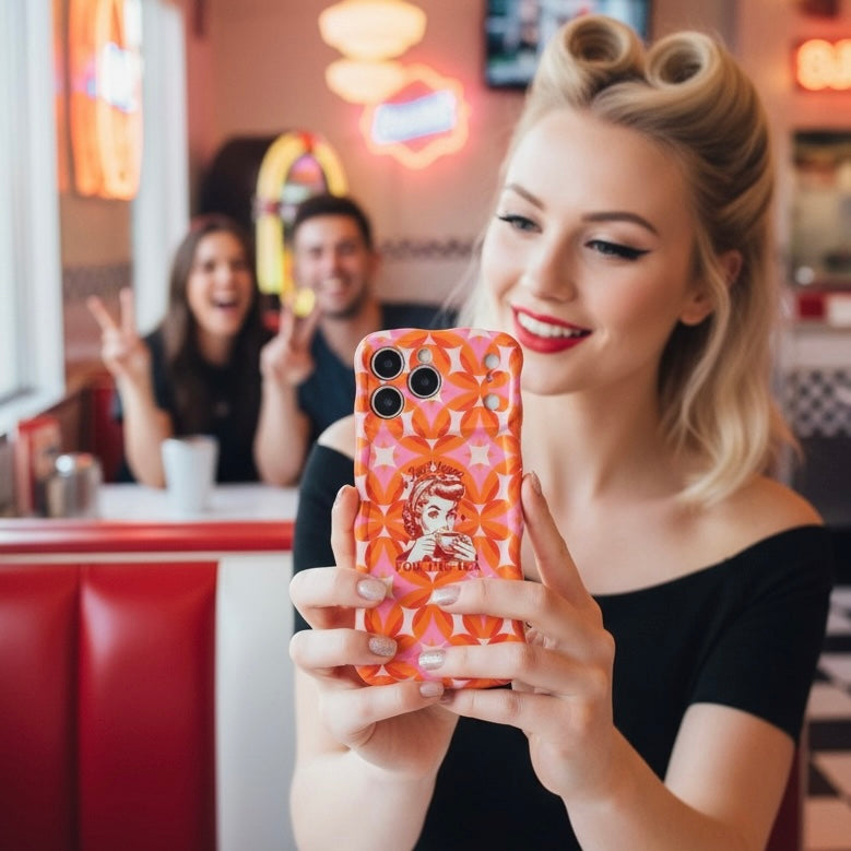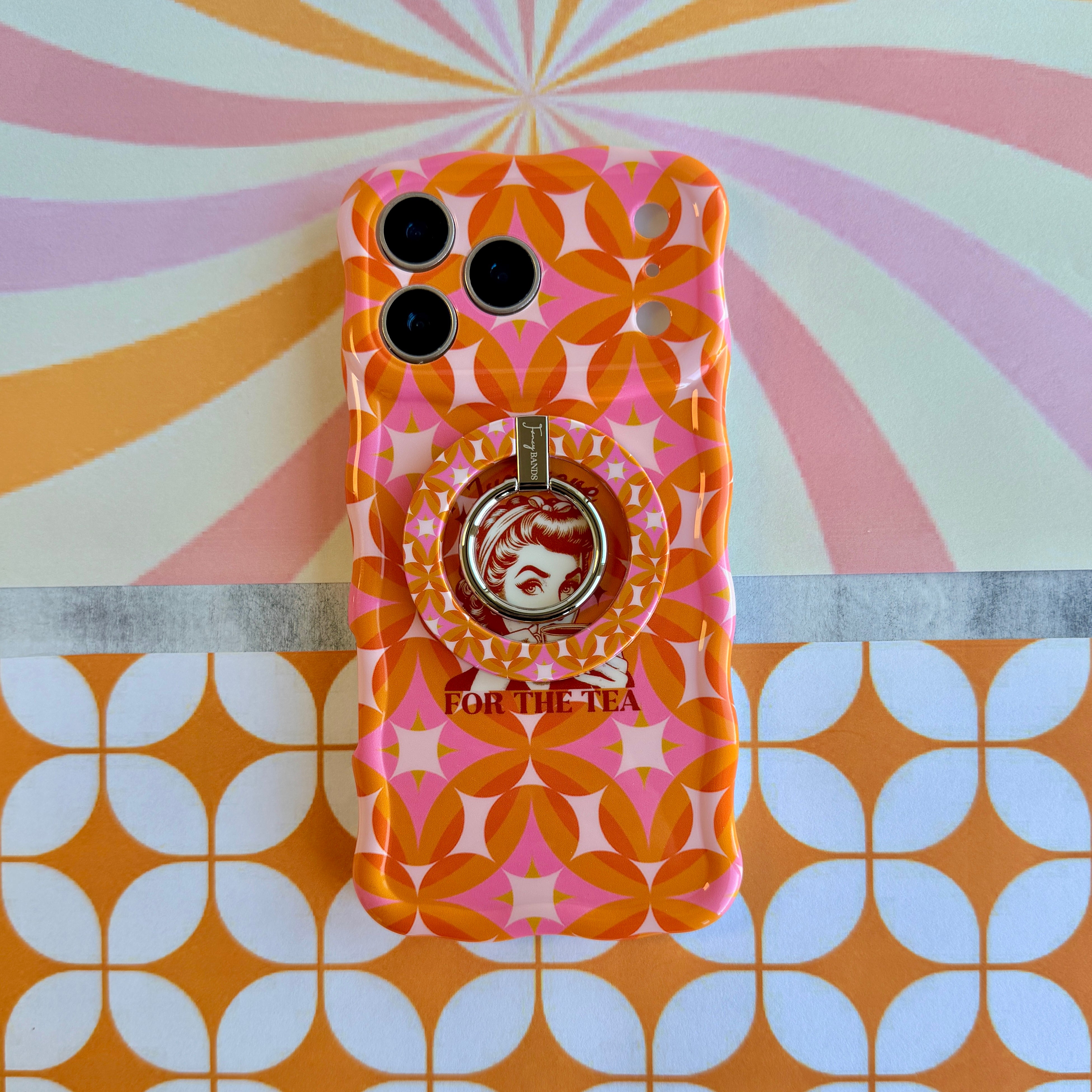 Serve up some serious style with the Gossip Girl Retro Edition Wavy Luxe MagSafe Case from Fancy Bands. This premium 60s mod aesthetic iPhone case is designed for those who love a bit of drama and a lot of color. Featuring a vibrant orange and pink geometric starburst pattern and a cheeky vintage illustration of a woman sipping her drink with the text "Just here FOR THE TEA," this case is the ultimate accessory for the modern-day gossip. ☕️💅