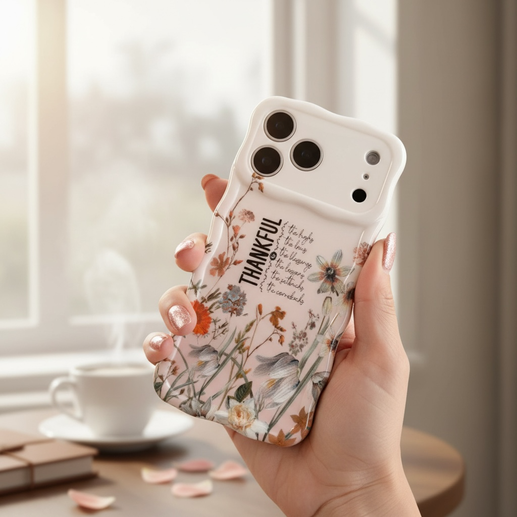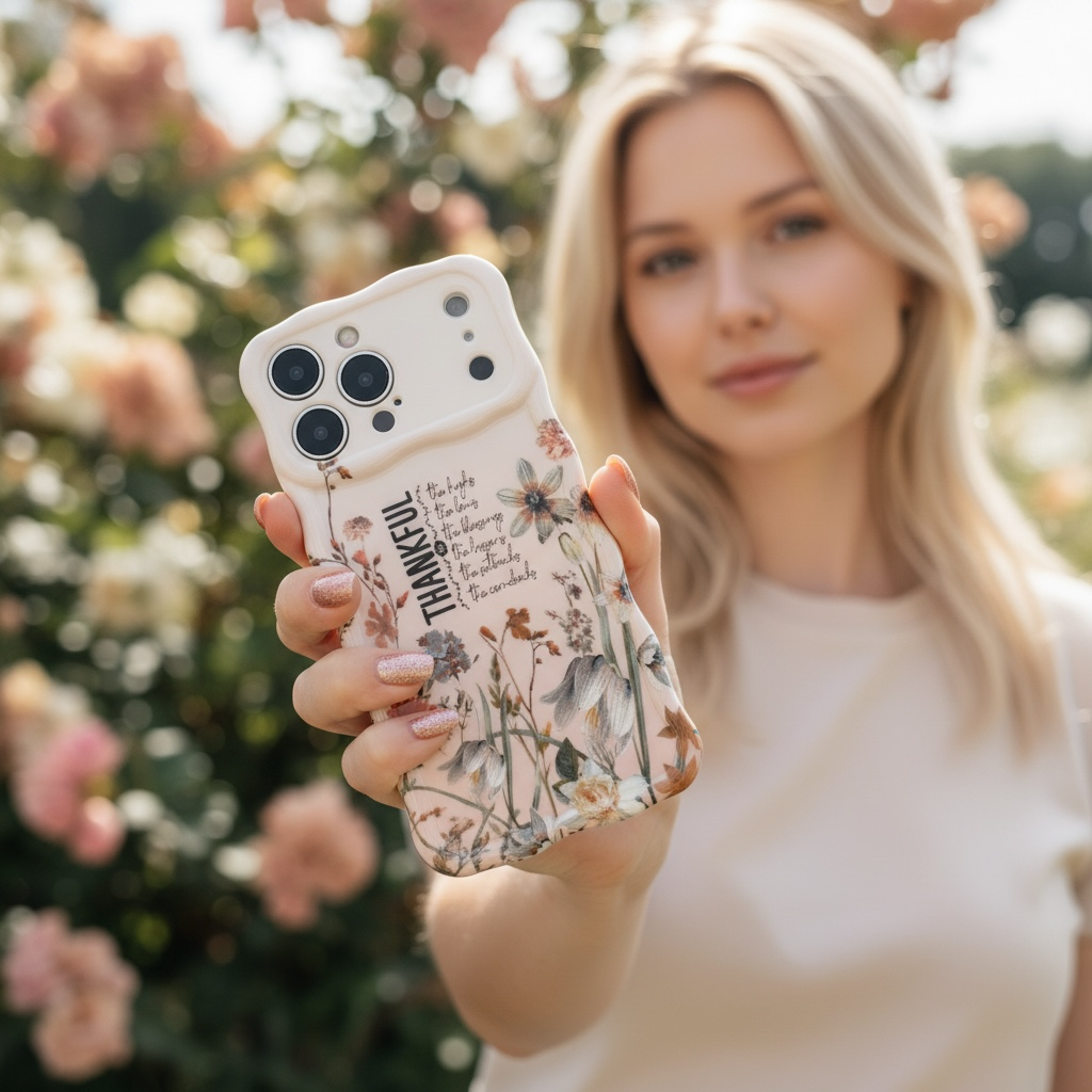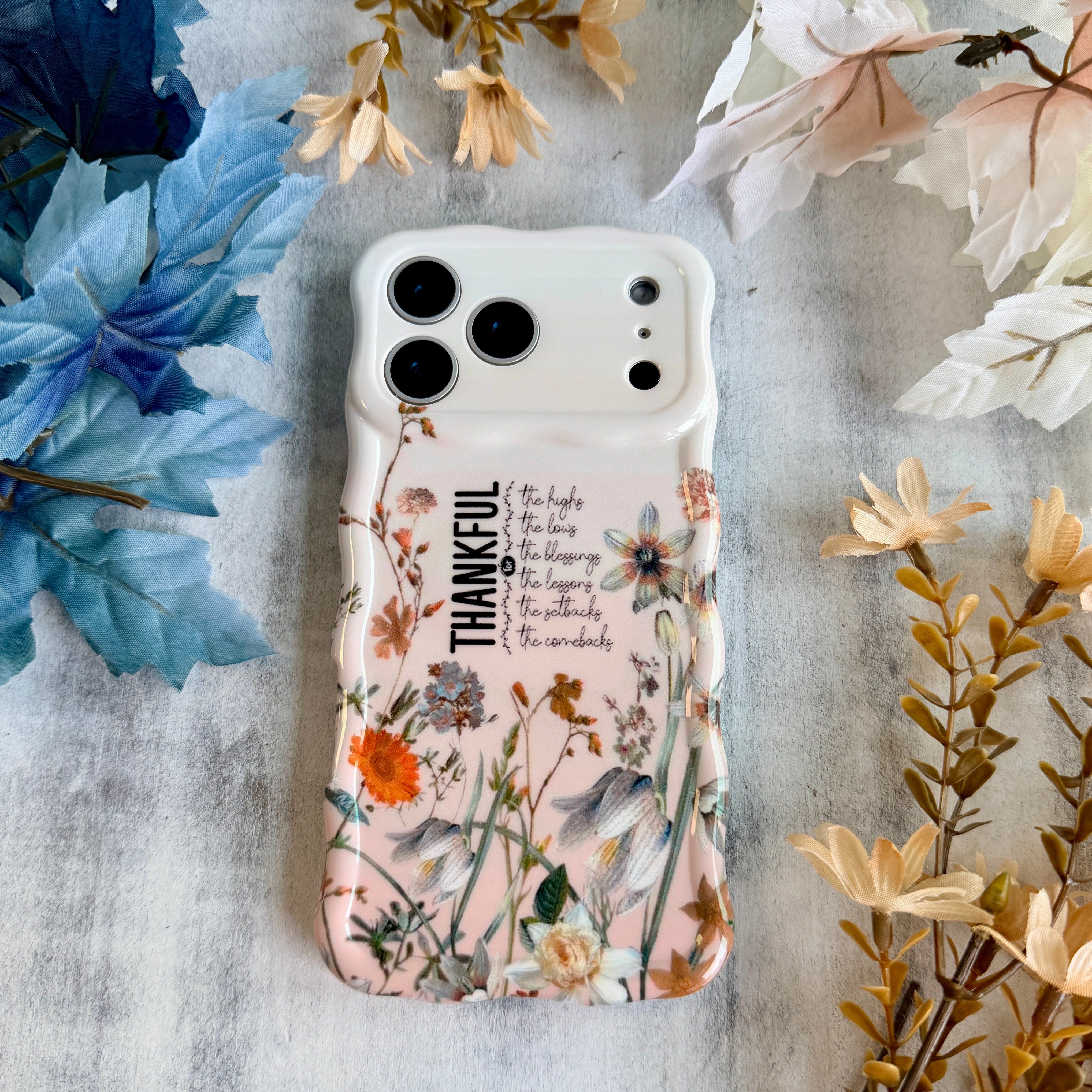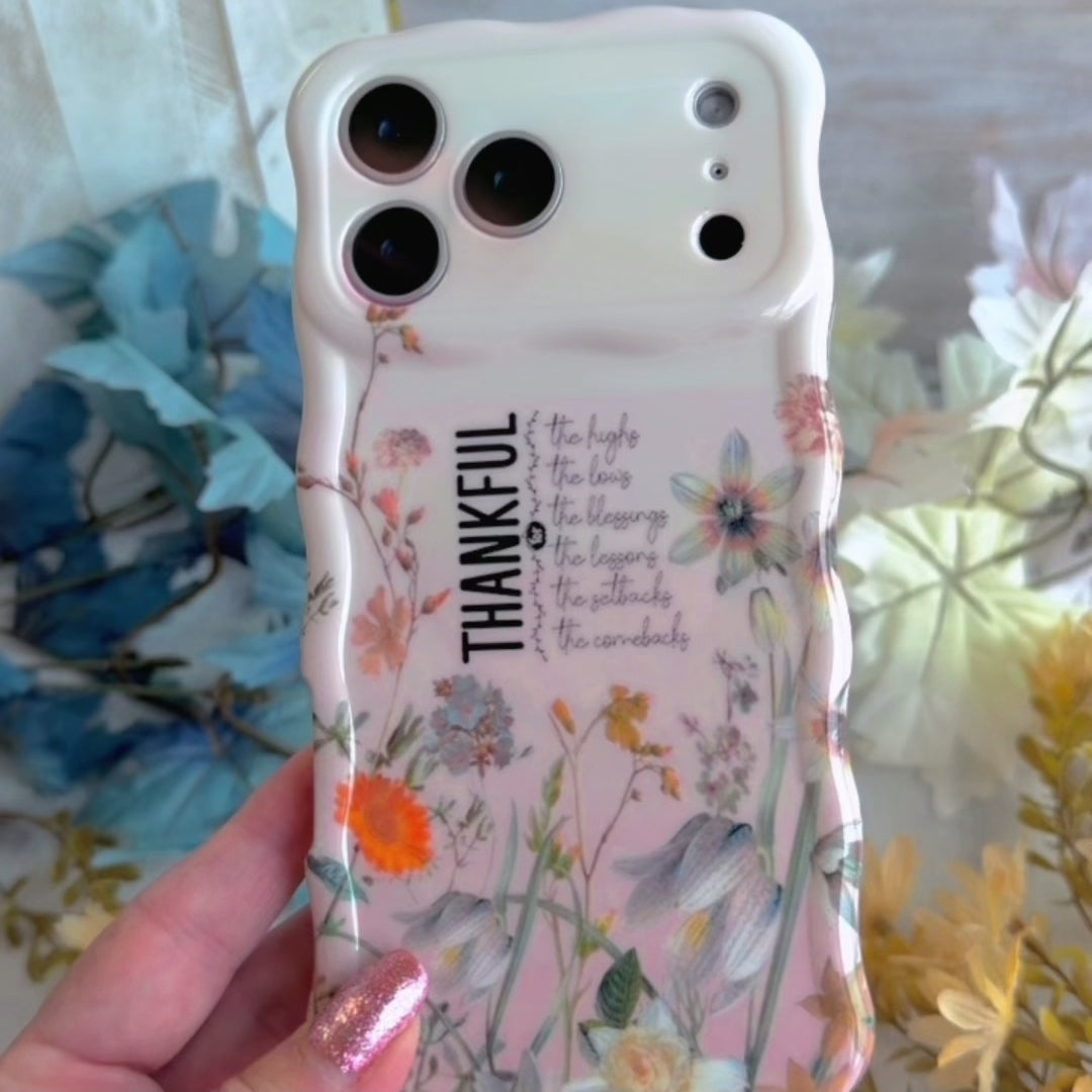 Carry a beautiful reminder of resilience and gratitude with the Harvest Grace Wavy Luxe MagSafe Case from Fancy Bands. This premium inspirational iPhone case blends a soft, vintage-inspired botanical aesthetic with a powerful daily affirmation. Featuring a delicate bouquet of wildflowers and the grounding mantra—"Thankful for the highs, the lows, the blessings, the lessons, the setbacks, the comebacks"—this case is designed to protect your peace and your phone. 🍂🌿