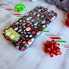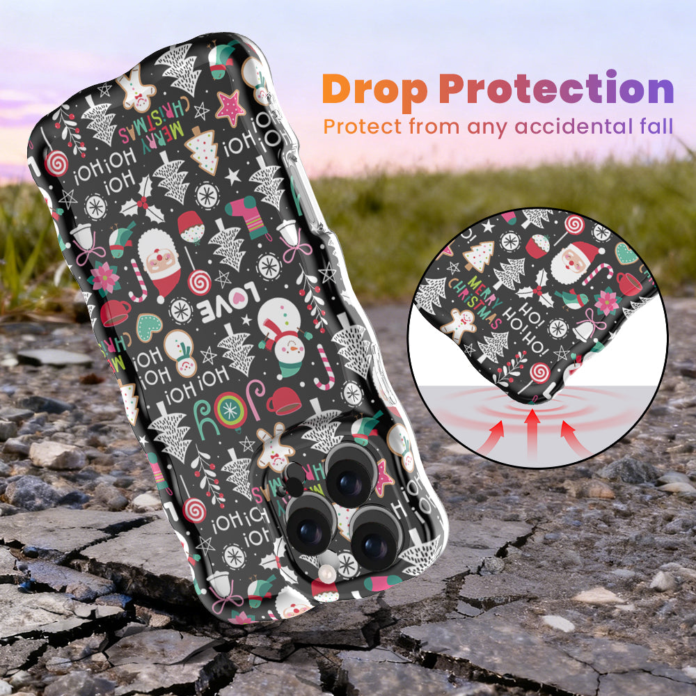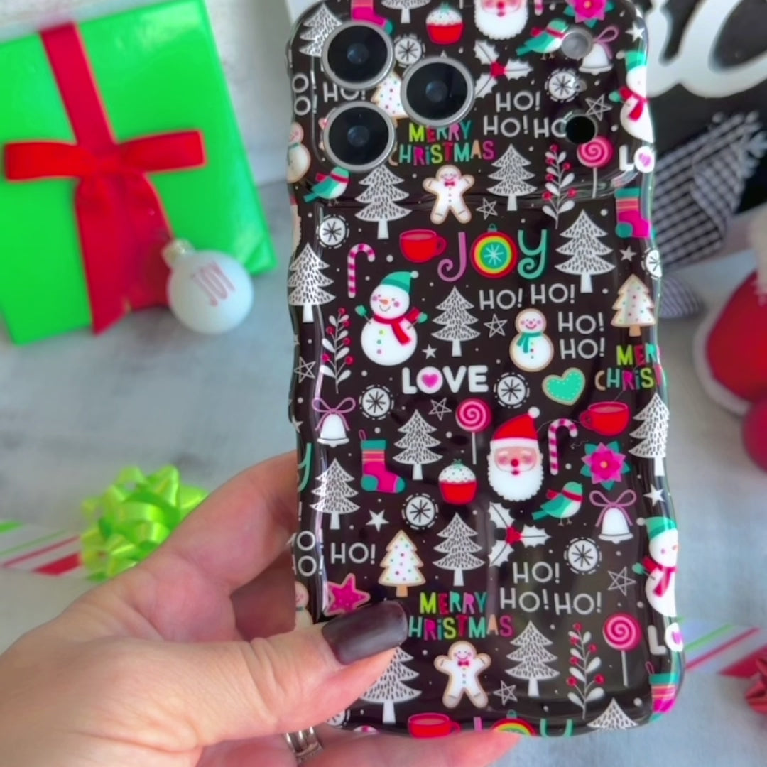 The Jolly Wristmas Wavy Luxe MagSafe Case is a glossy Christmas iPhone case filled with Santa 🎅, snowmen ⛄, candy canes 🍭, cookies 🍪, and twinkly trees 🎄 on a chic black backdrop. Our sculpted wavy edge gives a comfy grip for holiday selfies, while the slim profile delivers everyday protection—your go-to holiday phone case for festive parties, errands, and gifting.