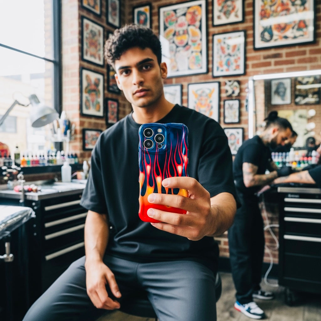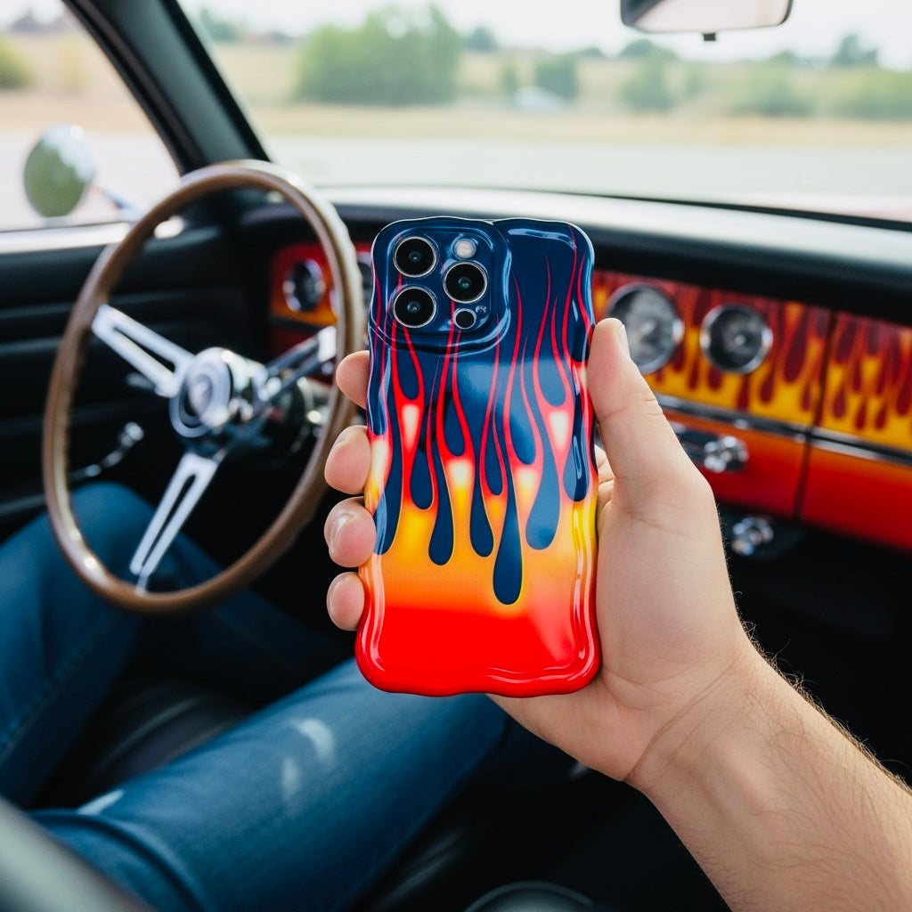 Whether you're a car culture fan, vintage hot rod lover, or someone who embraces bold rebellious style, this flame iPhone case from Fancy Bands celebrates your fearless attitude. The striking design features vibrant multicolored flames rising from the bottom in fiery orange, and electric yellow, against a dramatic black canvas—just like classic hot rod flame paint jobs. It's the perfect retro phone case for anyone who loves muscle cars, street racing aesthetics, Y2K nostalgia, and accessories that make a powerful statement. 🏎️✨