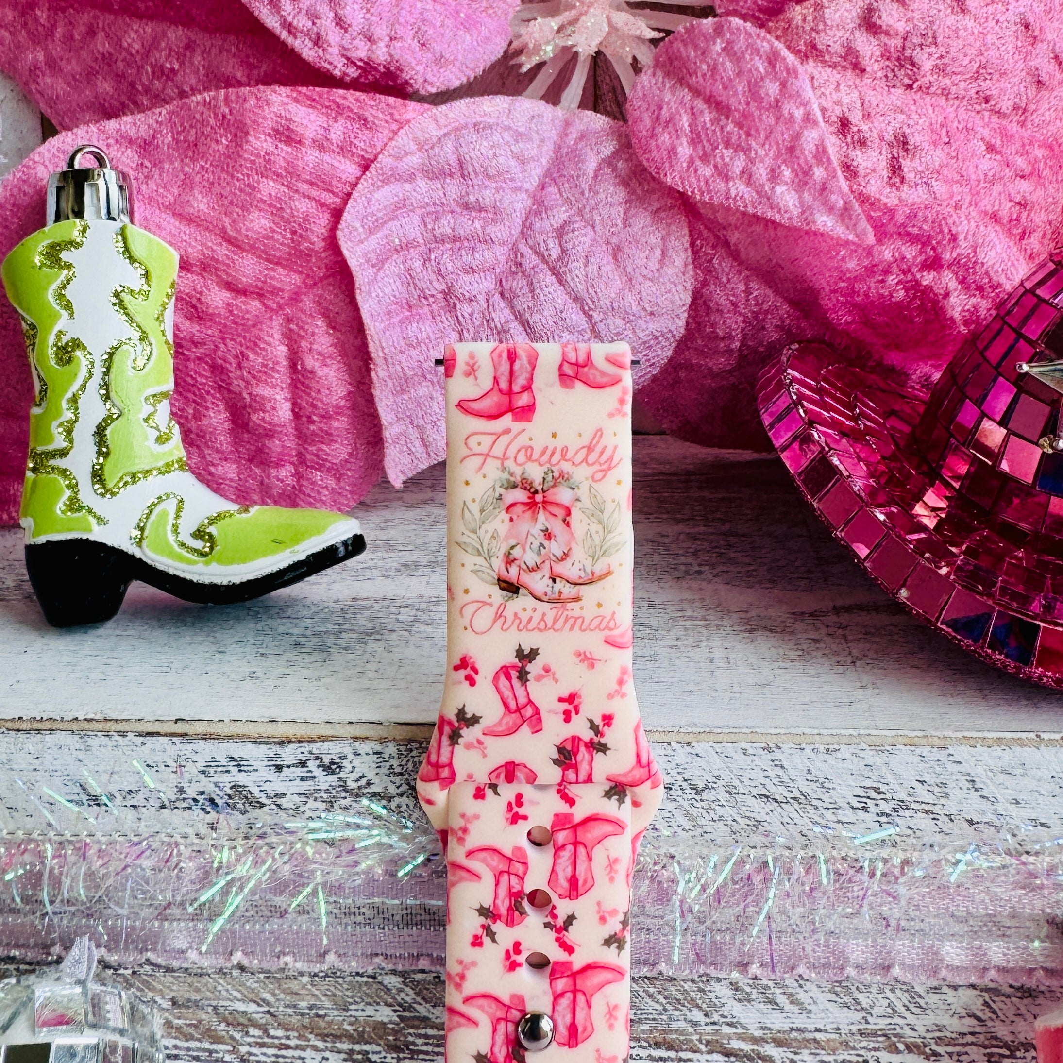 Saddle up for festive season. Howdy Holidays mixes cowgirl boots, lasso bows, and vintage “Howdy Christmas” script on a creamy blush base. This soft-touch silicone Samsung Galaxy Watch band stays light on your wrist, rinses clean in seconds, and keeps its colorfast artwork crisp from ornament-hanging to honky-tonk nights. Quick-release hardware lets you swap looks in a snap.