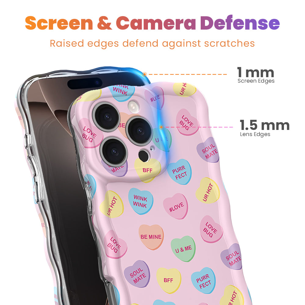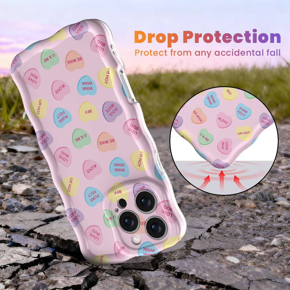 Pink wavy iPhone case featuring colorful candy conversation hearts with text like Be Mine, Ur Hot, and Soul Mate.