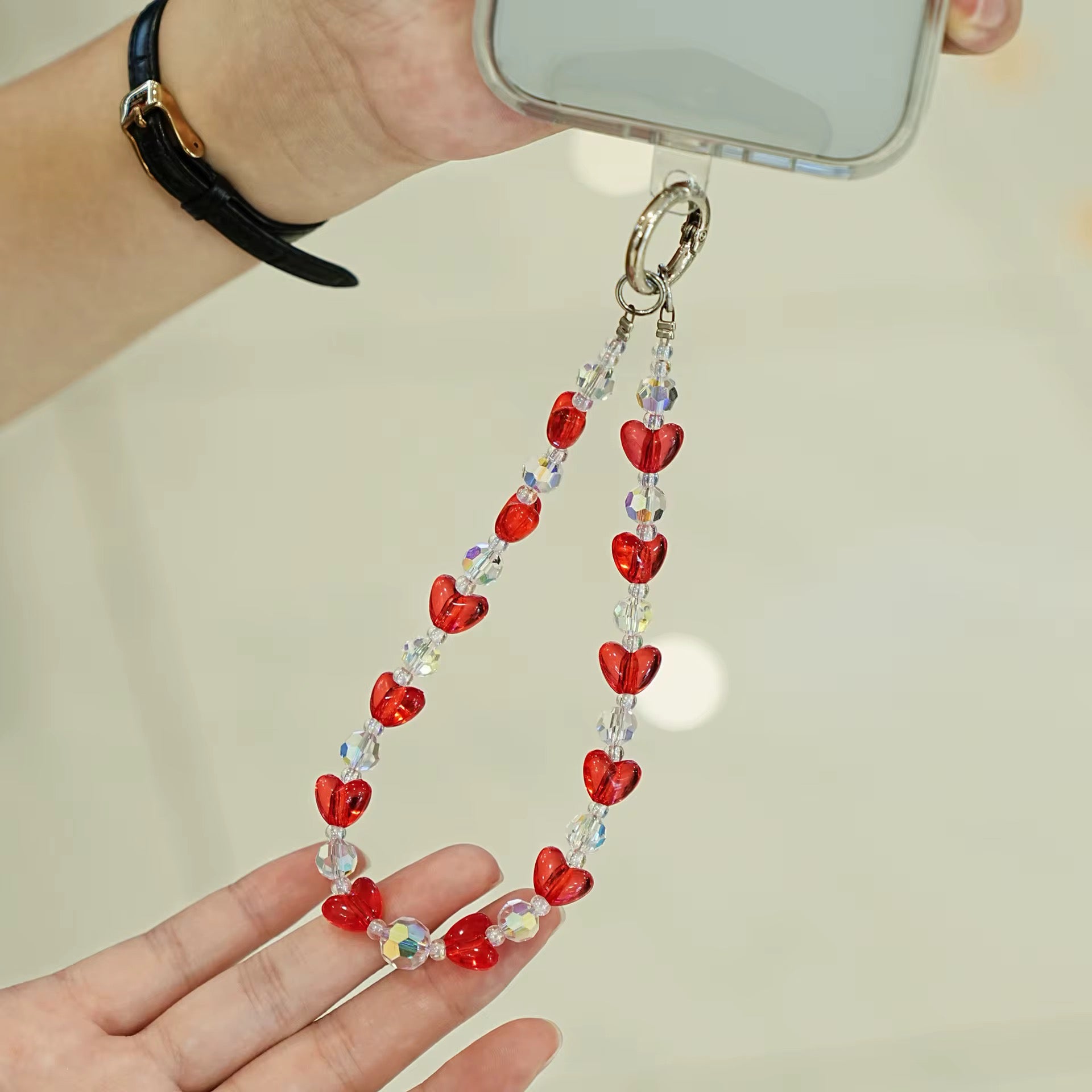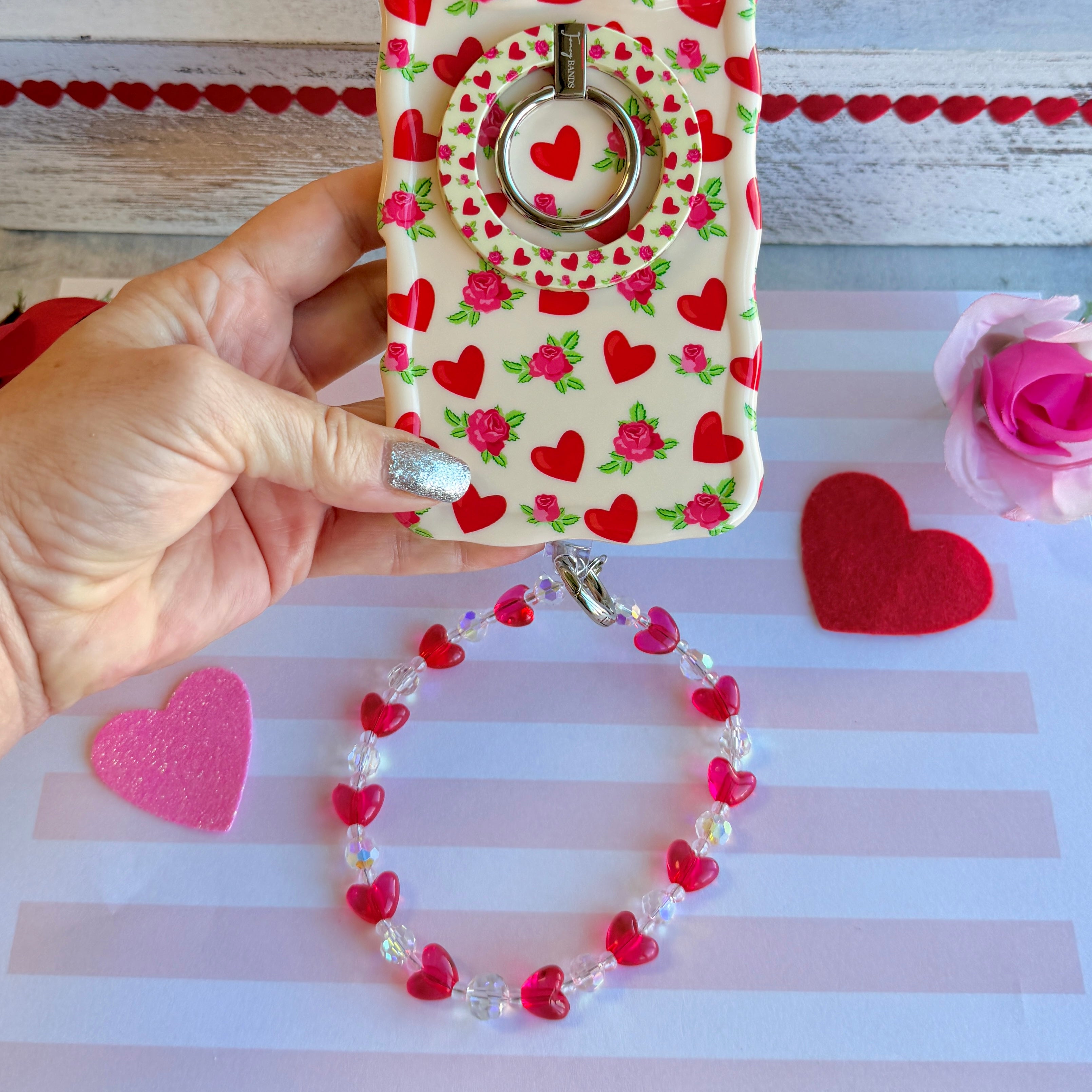 Candy hearts phone charm with translucent rainbow heart beads and crystal accents on conversation hearts phone case