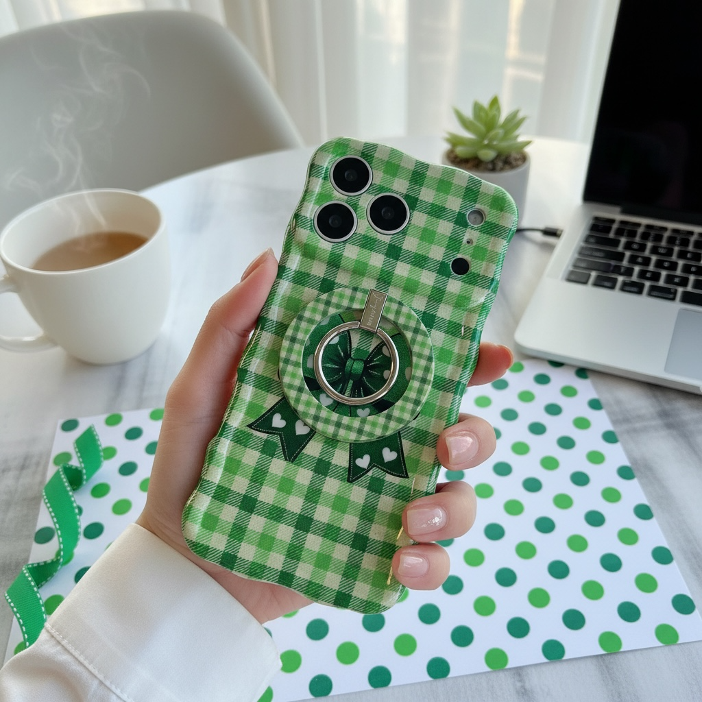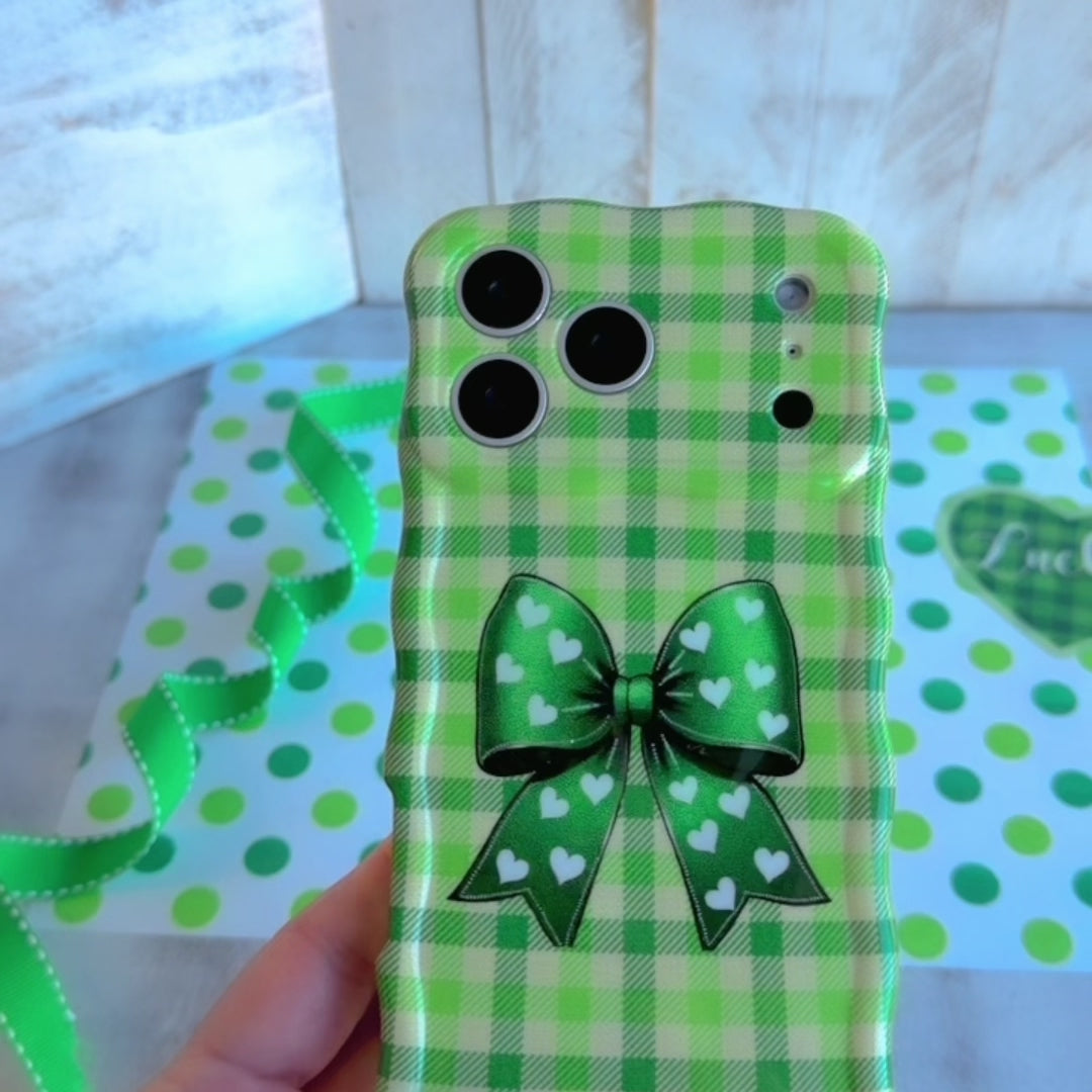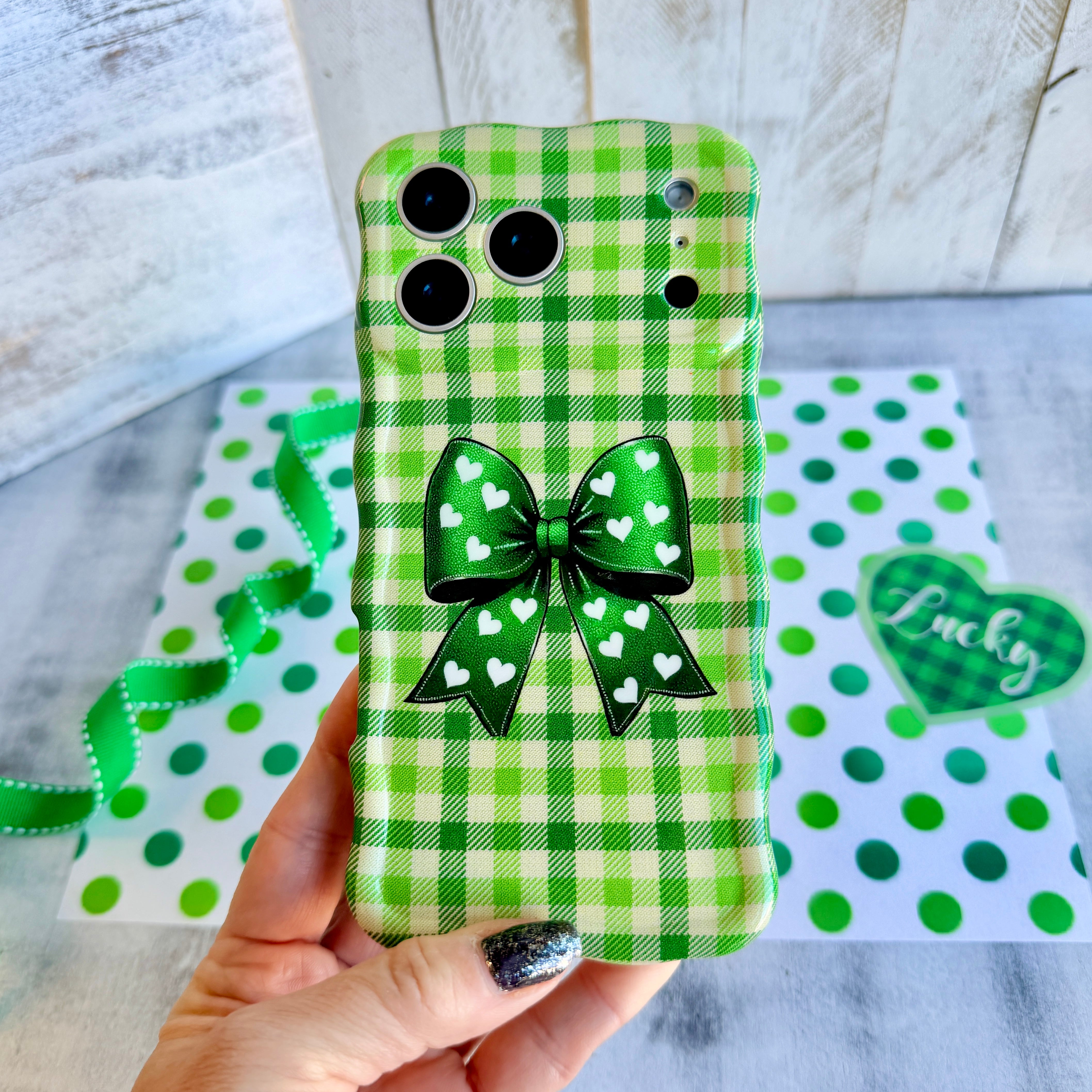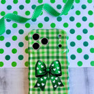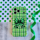 Light green gingham wavy iPhone case featuring a large green bow with white hearts in the center.