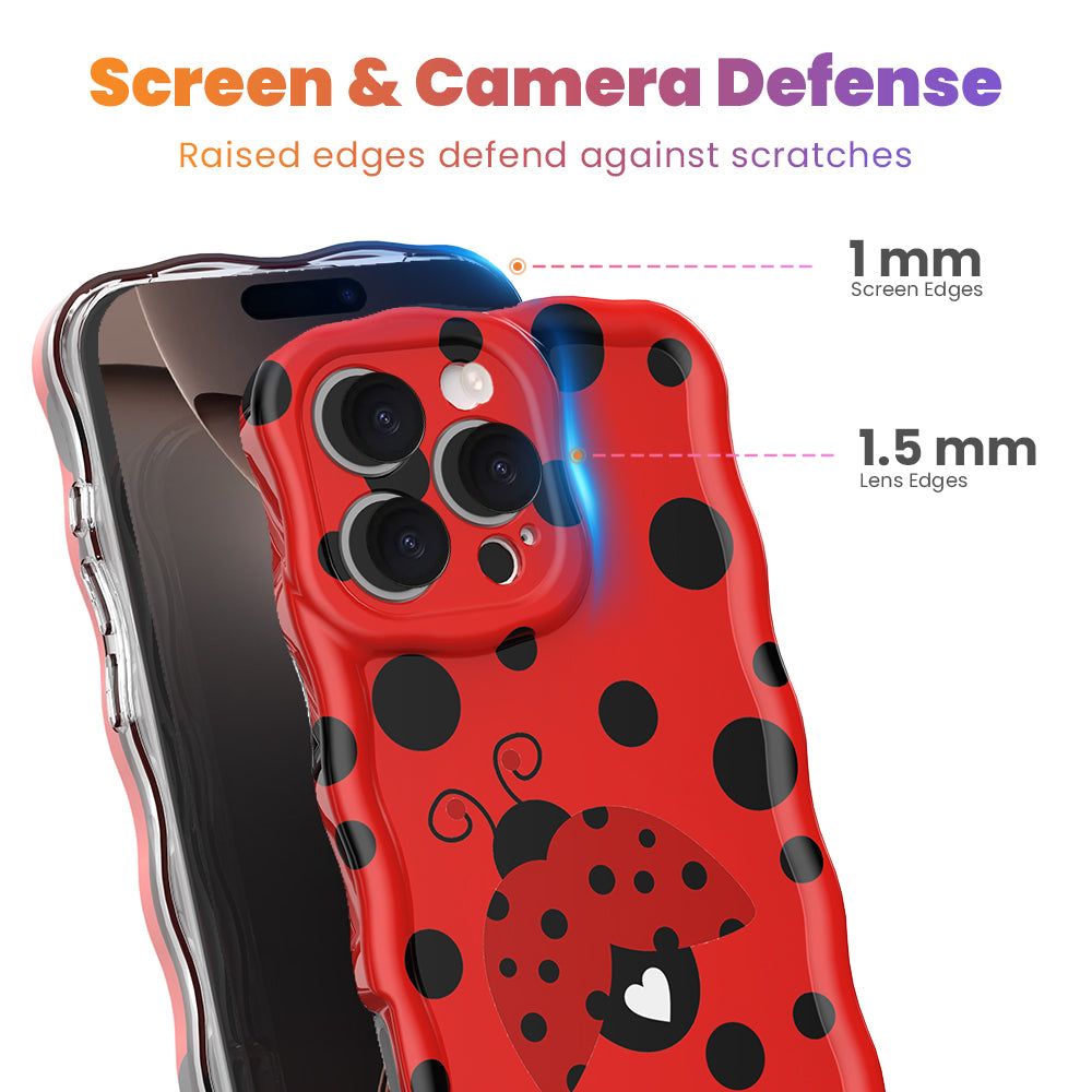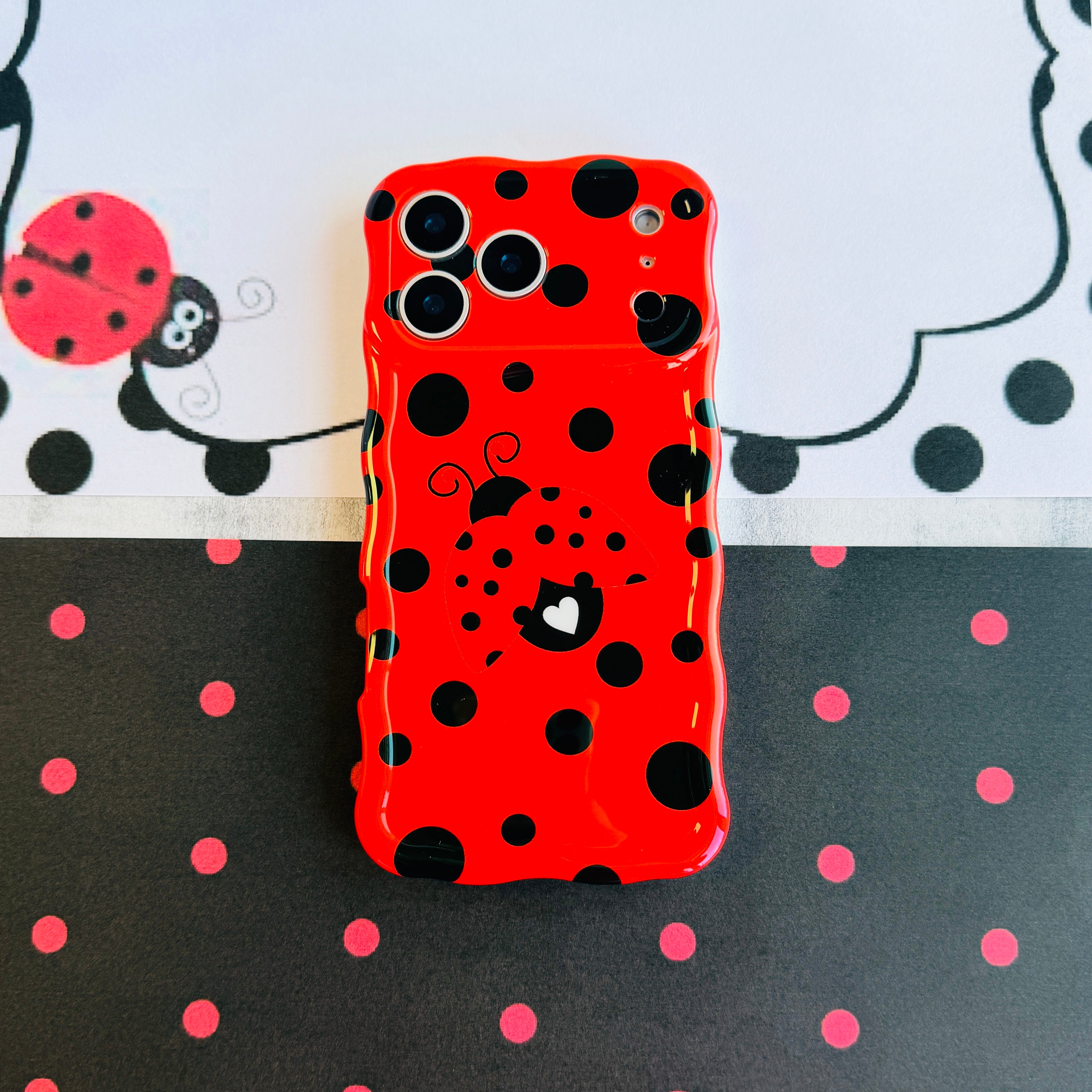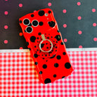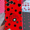 Bright red wavy iPhone case with large black polka dots and a central ladybug featuring a white heart on its wing.