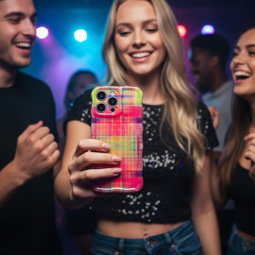 Whether you're a maximalist, color enthusiast, or simply someone who loves to stand out, this vibrant plaid iPhone case from Fancy Bands celebrates your unique personality. The hazy tartan design blends hot pink, lime green, purple, yellow, and orange in a mesmerizing pattern, while the holographic wavy edges catch the light with every move. It's the perfect aesthetic phone case for anyone who believes more color is always better and life is too short for boring accessories. 🎨✨
