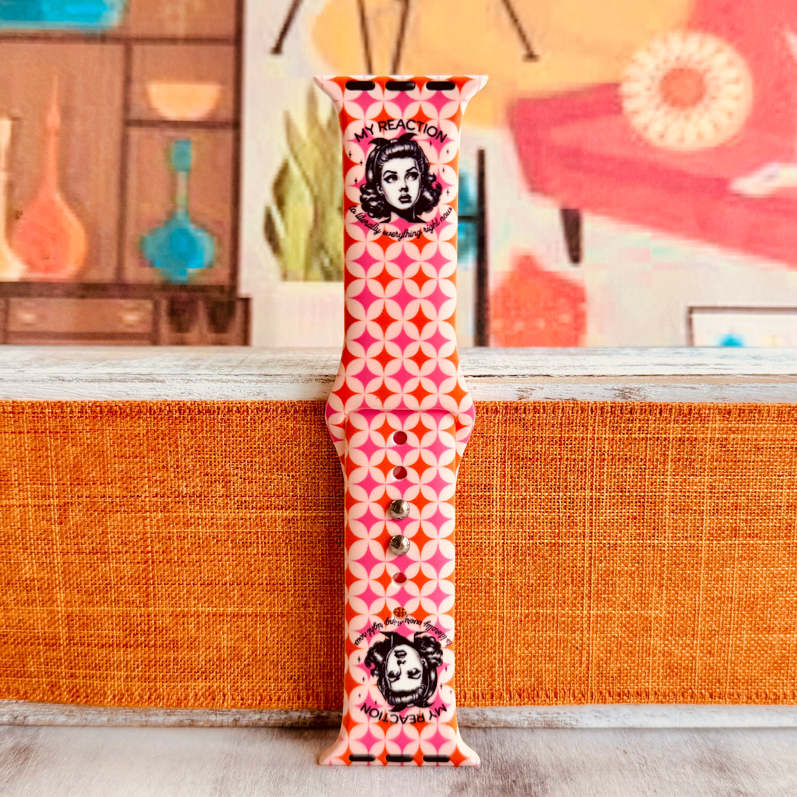 Your mood, but a band! This sassy My Face Says It All Apple Watch band features a bold retro woman with attitude on vibrant pink and orange geometric pattern. Perfect for expressing yourself without saying a word—because sometimes your face really does say it all.