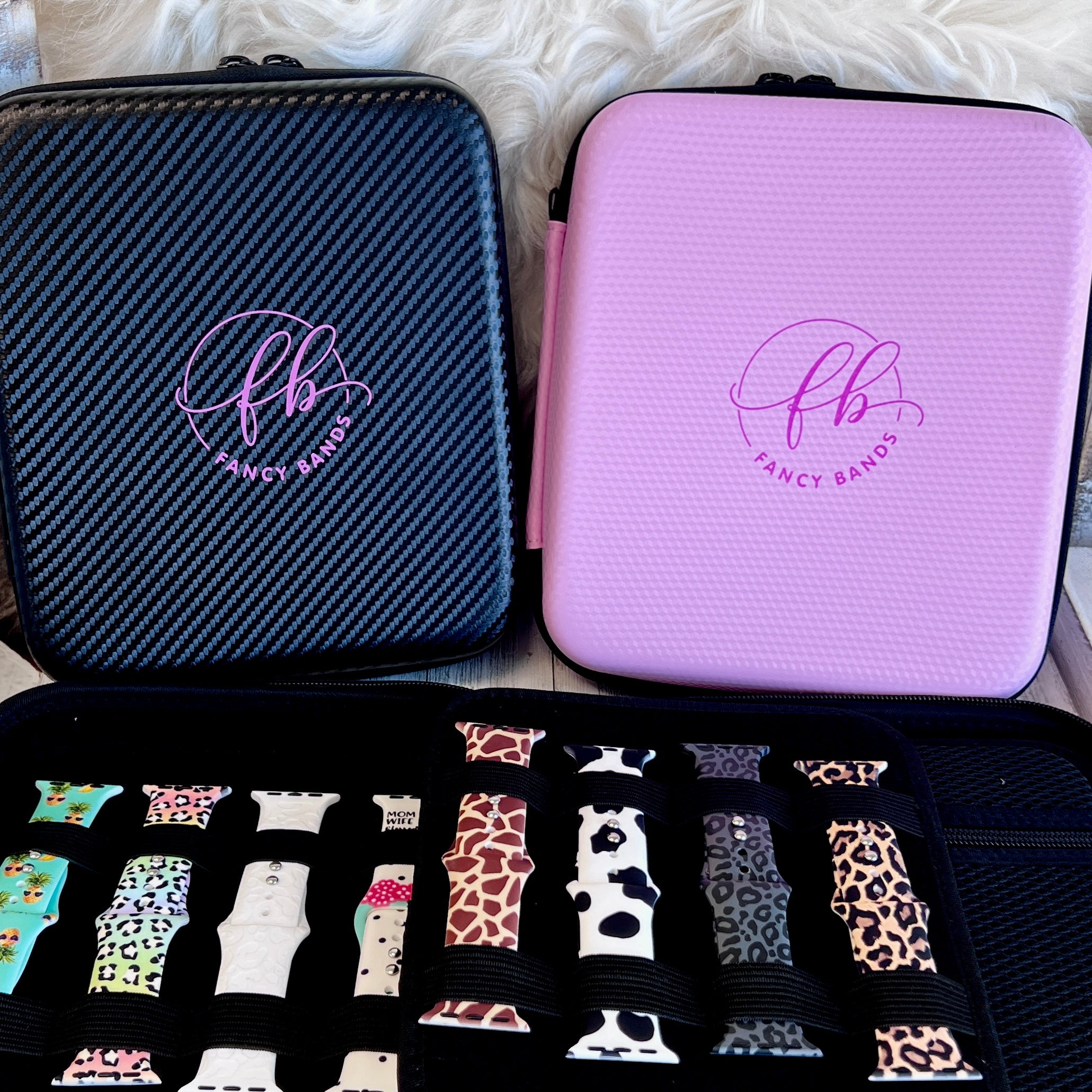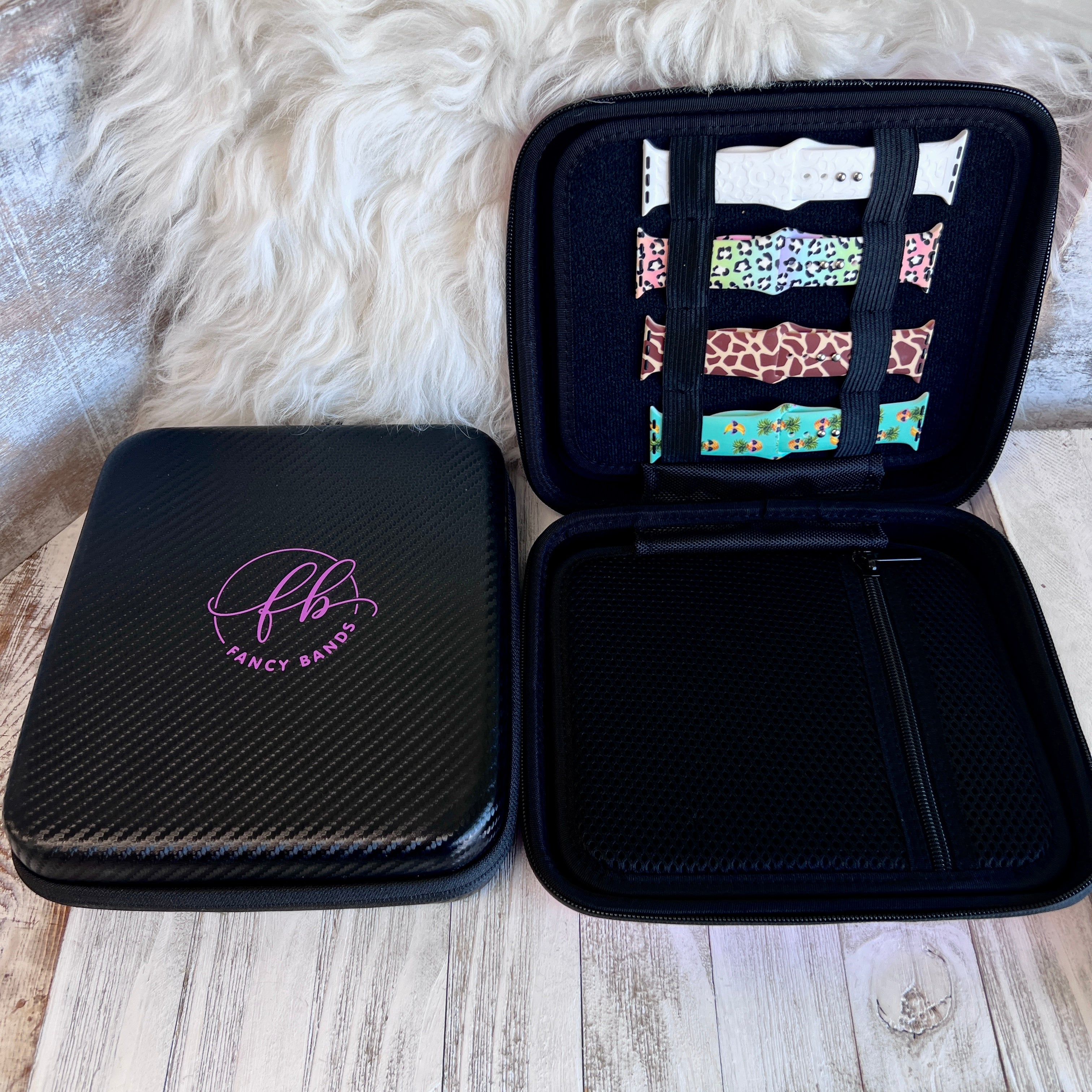 - This Is a must have accessory for any Fancy Band Collector! A super Fancy case you can use for organizing and storing your Fancy Bands! The outer water resistant hard shell will protect and keep your bands looking Fancy. Custom molded foam compartments allow for storage of 16+ bands. It also has a mesh storage flap that can hold your charger, cables, tools, and small accessories.