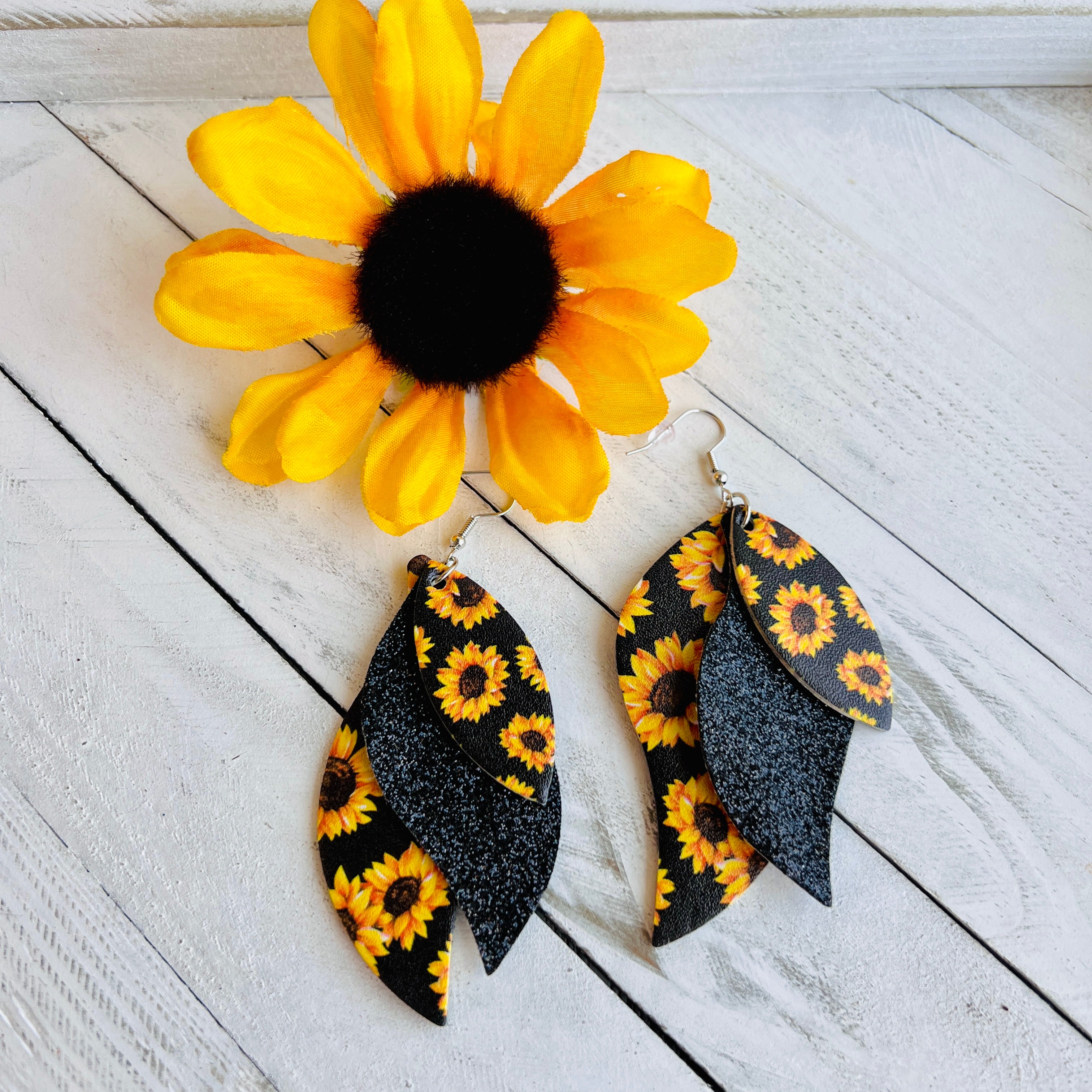 Sunflower Black Background Faux Leather Teardrop Ear Bling Two Styles Available